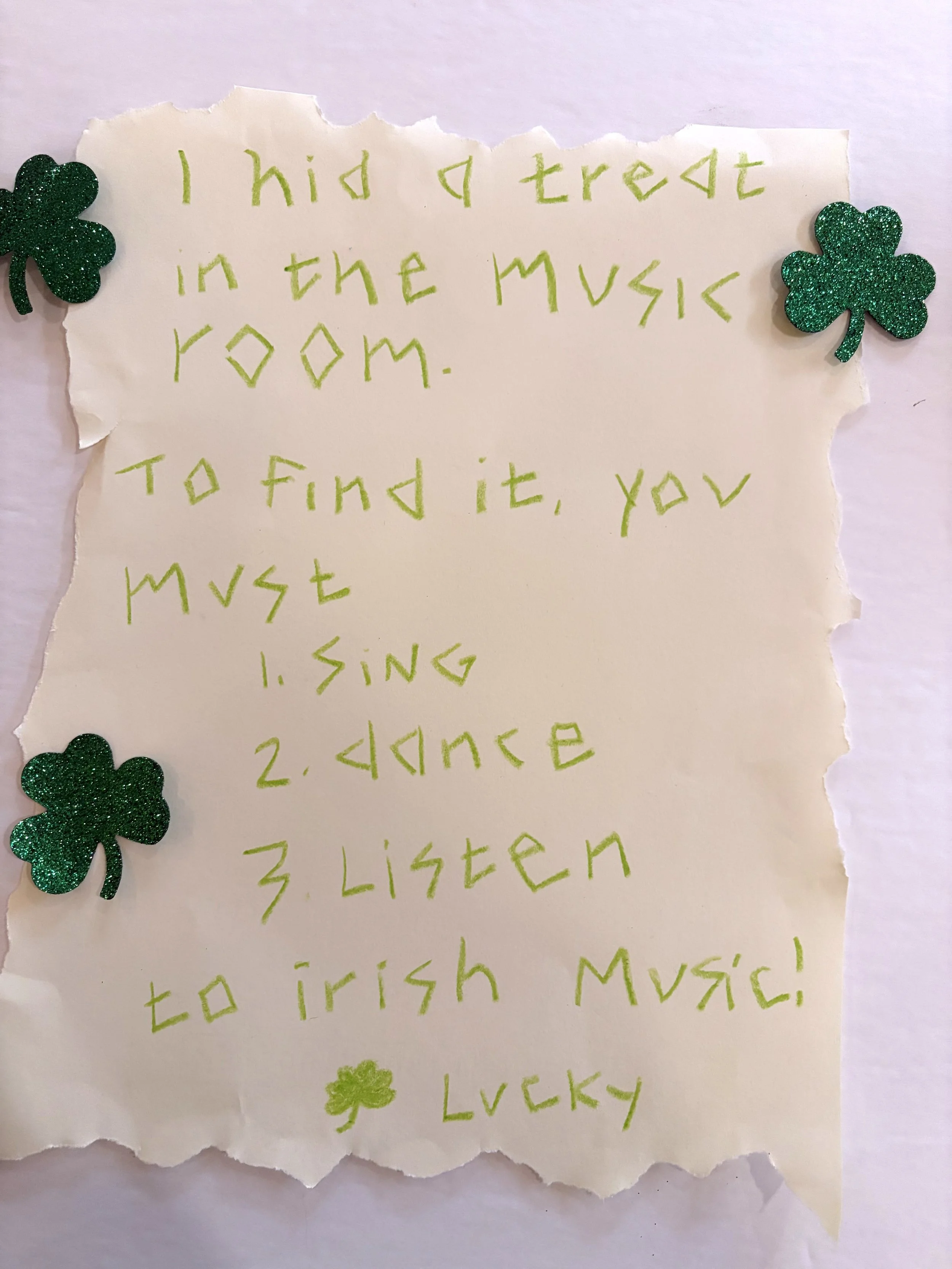 One of the most fun lessons I ever did happened on a whim. I had some extra chocolate coins and a tiny cauldron from a party, so I decided to tell my students a leprechaun hid something in the room. I acted confused about a note that I found slipped under the door (conveniently right before first grade music class!)