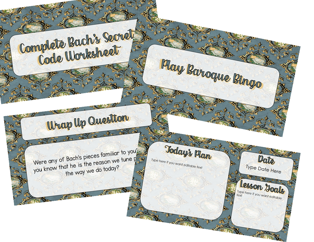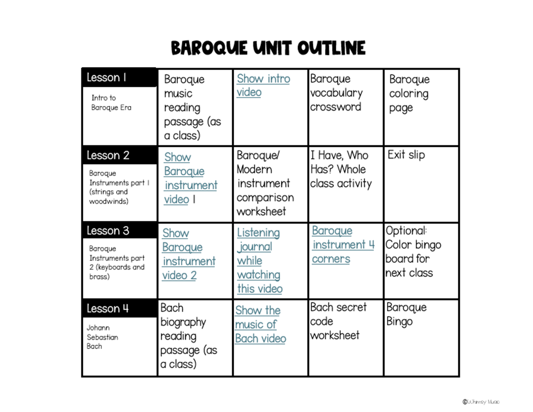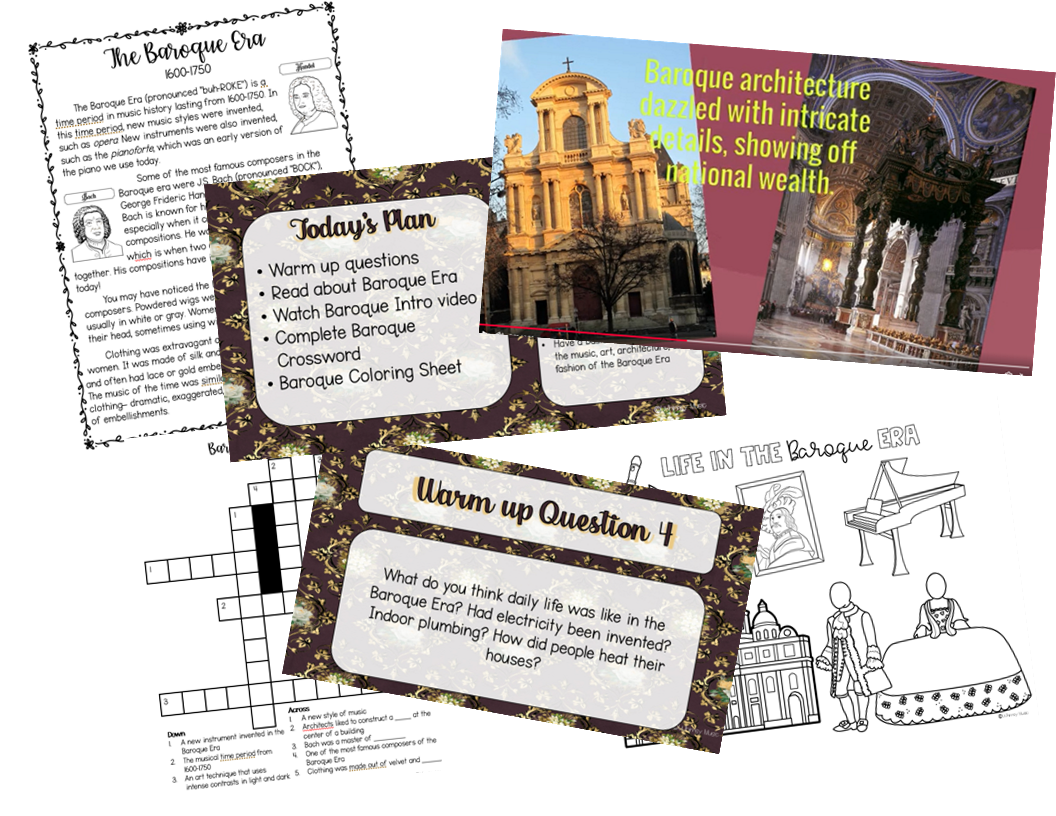 These long term music sub plans currently cover four 45-minute class periods and are all about the Baroque Era in music. If you know anything about music, you probably know that the Baroque Era is not the most interesting topic to 9-12 year olds, but I included a fun activity in each lesson that this age group loves no matter the topic. (My students would play bingo, 4 corners, and do readers’ theaters every class if I let them!)