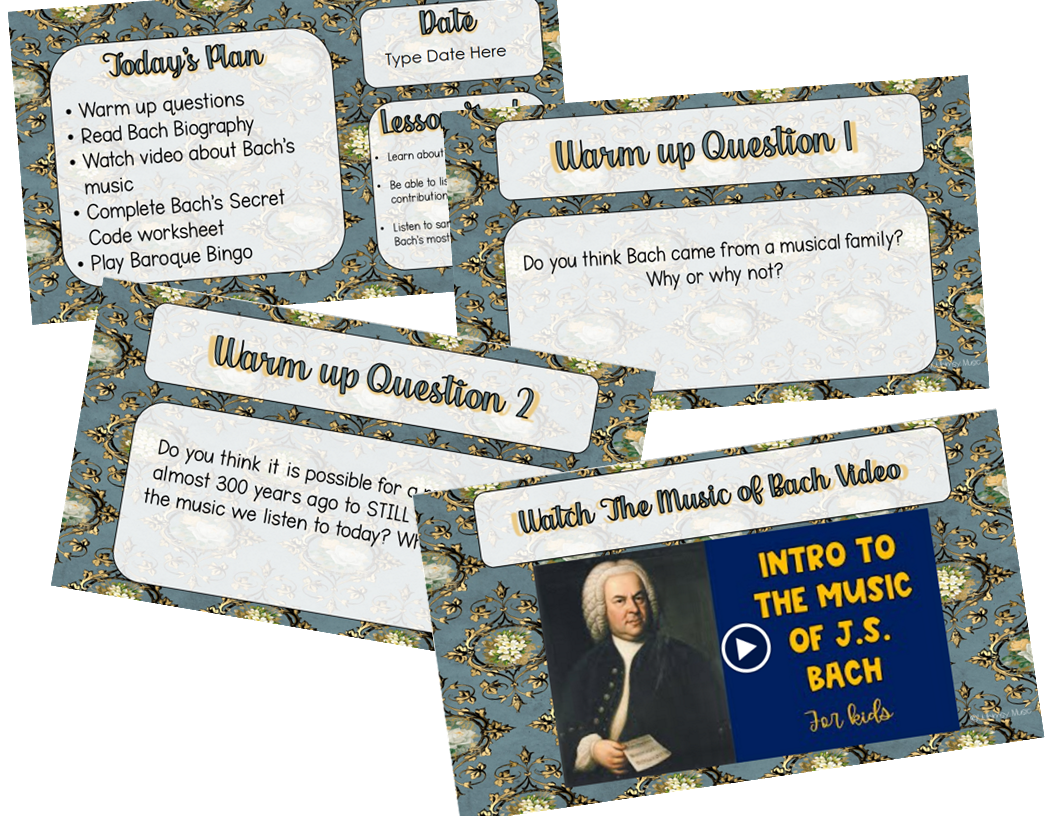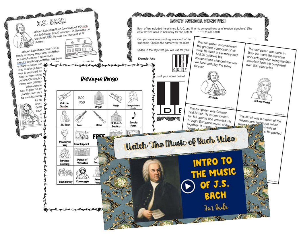 Now we’re getting into the heart of the Baroque Era: J.S. Bach, possibly the most famous composer of all time. But don’t worry, this lesson is not like reading a college music history textbook. I included some facts about Bach that would be interesting to 9-12 year olds, like the fact that Bach used the letters of his name to make a secret code (B=2, A=1, C=3, H=8). Students will take their own name to make secret codes and write rhythms based on their names.