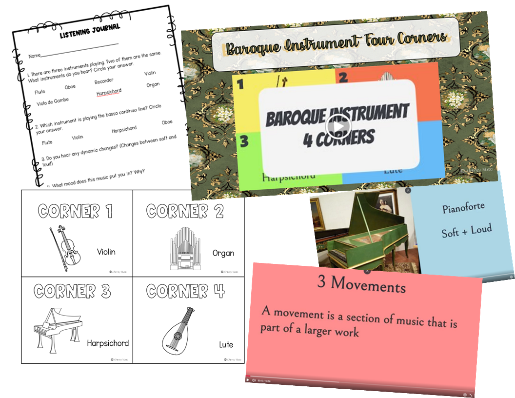 If you think this lesson will bore the kids, the fun part happens at the end in the form of Baroque Instrument Four Corners! The sub will have to decide if they want students moving around the room or using the “Seated Four Corners” cards that are included.