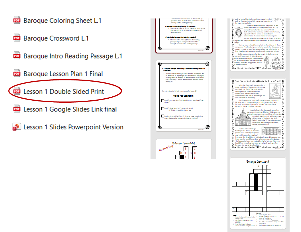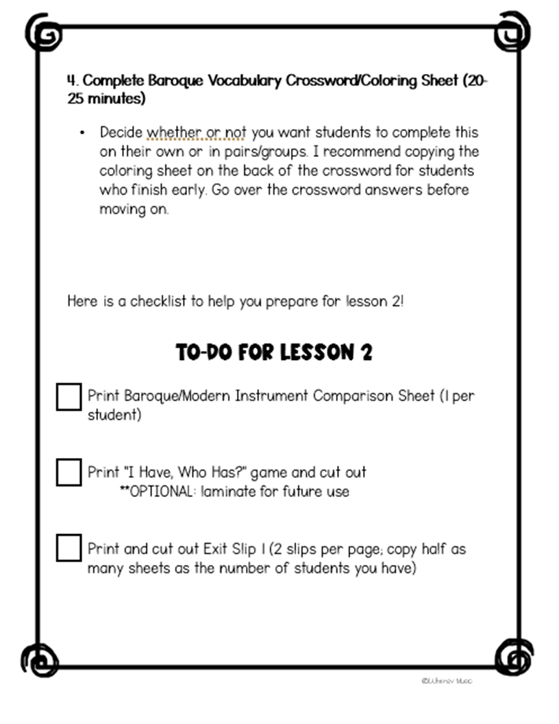 These aren’t Edu 101 lesson plans–a sub doesn’t have time to sift through all the irrelevant information to find the details they actually need. Instead, each lesson includes a plan with materials and lesson steps, plus a checklist to help prepare for the next lesson. That’s it. (If your administrator wants to know whether or not these plans align to national or state standards, they absolutely do. They cover music history, composers, note values, instrument families, and connect to other disciplines such as art and history.)