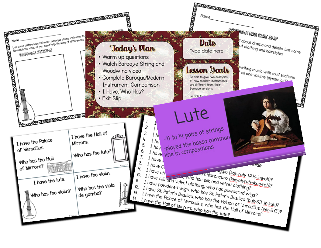 This lesson includes a video showing photos of real Baroque era instruments as well as audio clips for students to listen to. They will then fill out a modern instrument vs. Baroque instrument comparison worksheet.